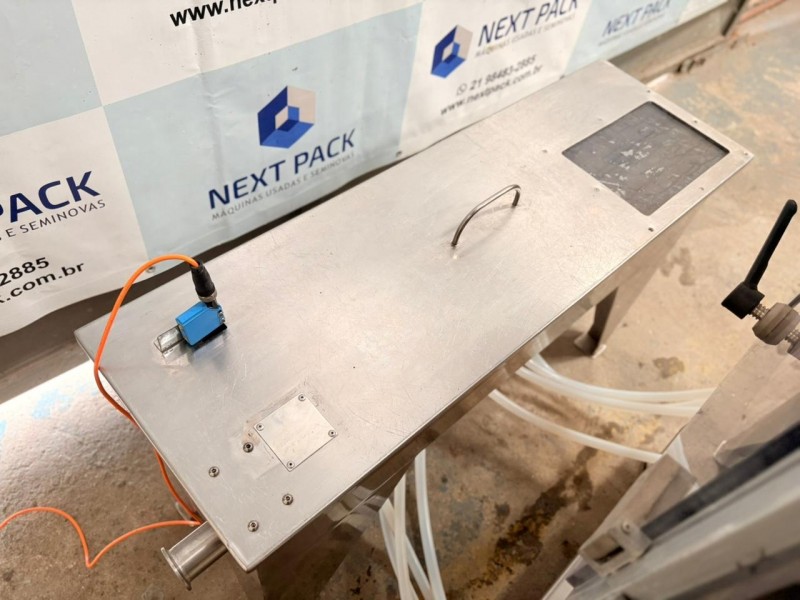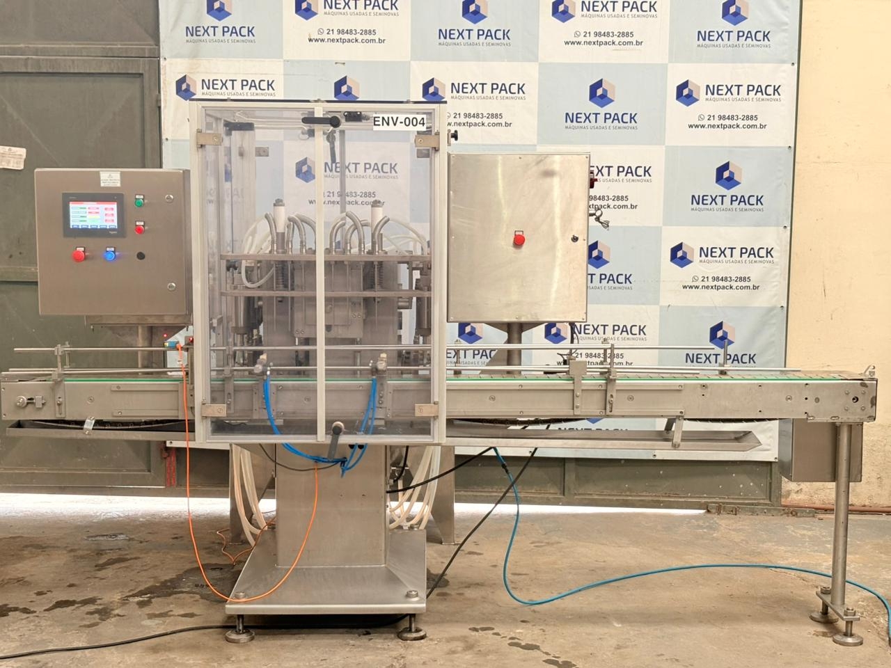 Envasadora Linear automática por audição, com 8 bicos, possui tanque leve interligado de 60 L e é indicada para volumes de 50 a 300ml