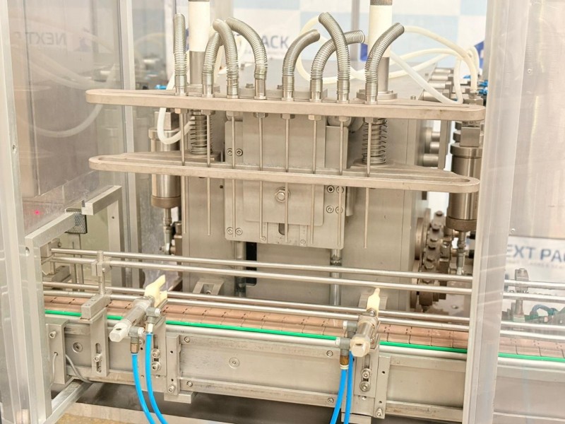Altura máxima do frasco para essa Envasadora: 225mm de altura total. Diâmetro máximo de frasco para essa envasadora com 8 bicos: 70 mm. O equipamento conta com sistema de movimento vertical (sobe e desce) do bico dosador, com curso de até 100 mm, permitindo a inserção controlada do bico dentro do frasco para reduzir a formação de espuma durante o envase. Por exemplo, ao trabalhar com frascos de até 200 mm de altura, o bico poderá descer até 100 mm no interior do frasco, proporcionando um envase mais preciso e seguro.