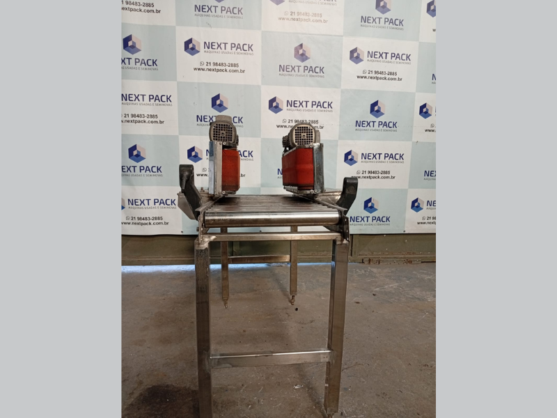 Equipamento utilizado para entrega de frascos e embalagens em linhas de produção. Modelo com massageador acoplado, ideal para alinhamento e acomodação de produtos.
