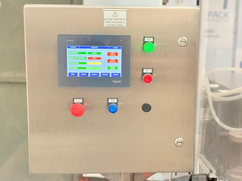 velocidades que podem ser programáveis para o curso do ouvir. Essa funcionalidade é especialmente eficaz para produtos que espumam: o envase inicia em velocidade reduzida (cerca de 20% do curso), e, após essa fase inicial, retorna à velocidade máxima para completar o enchimento com eficiência e controle, nos 20% final a velocidade é reduzida novamente para evitar que a espuma saia do frasco. Para validação do processo, solicitamos um lote de 100 litros do produto e aproximadamente 500 frascos, a fim de realizar testes práticos e garantir a eficiência da aplicação conforme as necessidades do cliente.