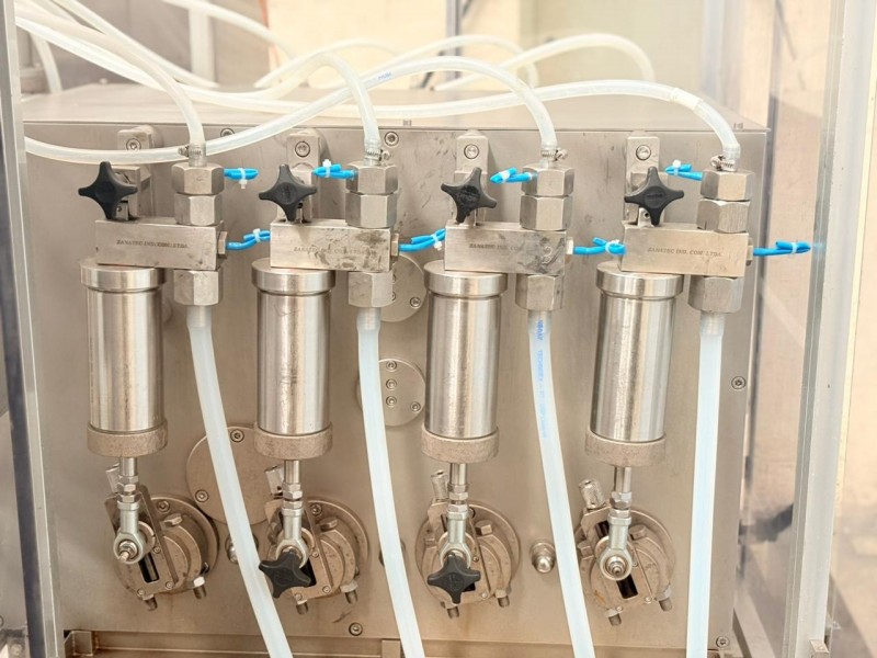 Altura máxima do frasco para essa Envasadora: 225mm de altura total. Diâmetro máximo de frasco para essa envasadora com 8 bicos: 70 mm. O equipamento conta com sistema de movimento vertical (sobe e desce) do bico dosador, com curso de até 100 mm, permitindo a inserção controlada do bico dentro do frasco para reduzir a formação de espuma durante o envase. Por exemplo, ao trabalhar com frascos de até 200 mm de altura, o bico poderá descer até 100 mm no interior do frasco, proporcionando um envase mais preciso e seguro.