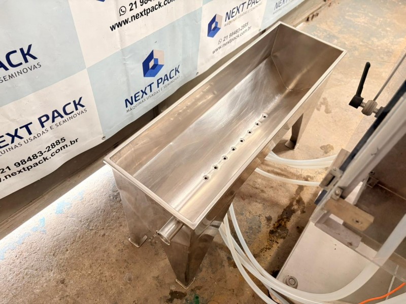 Envasadora Linear automática por audição, com 8 bicos, possui tanque leve interligado de 60 L e é indicada para volumes de 50 a 300ml