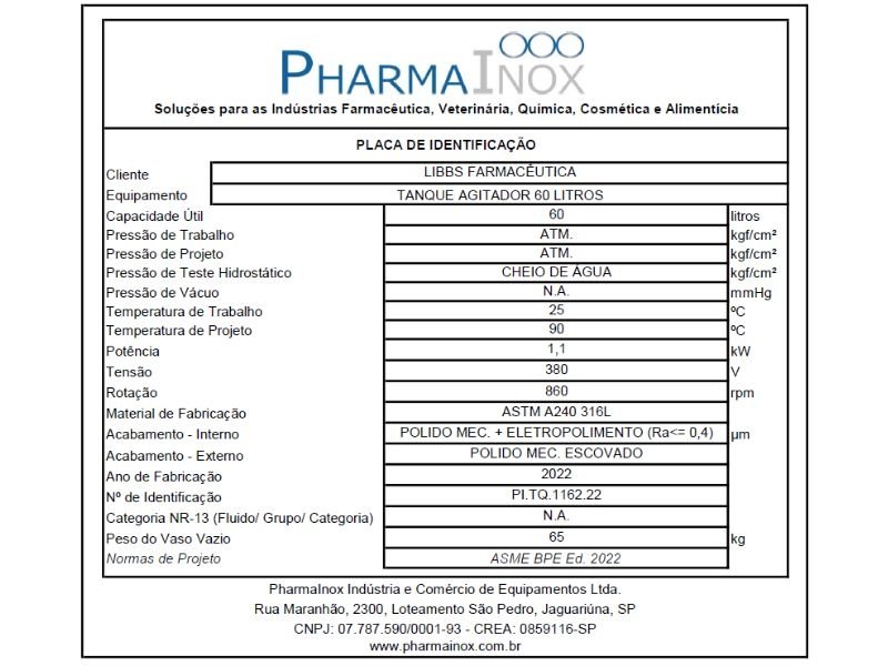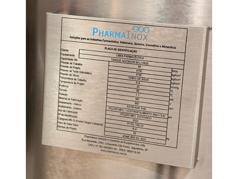SUSPENSÕES FARMACÊUTICAS 60L – PHARMAINOX é sua construção totalmente em