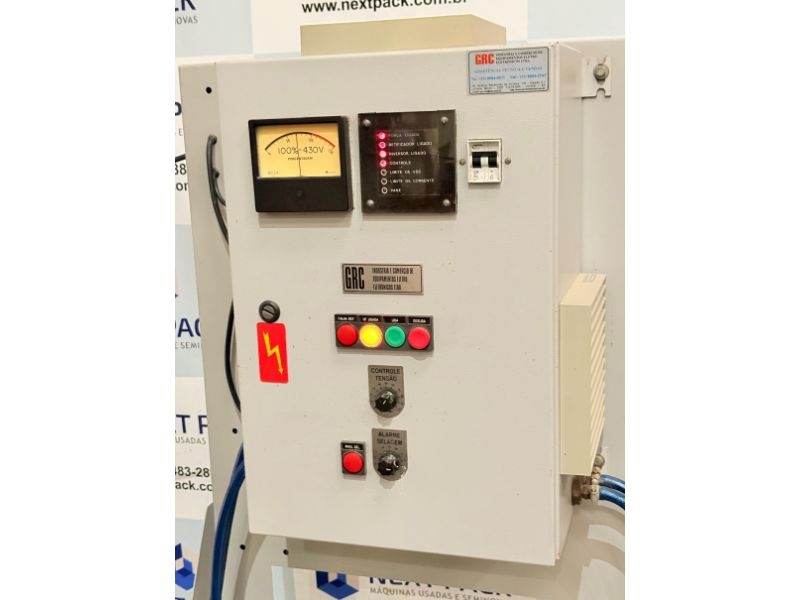 Seladora por indução GRC – 2 KW, equipamento composto por: seladora, cabo de alimentação e cabeçote de selagem com suporte para acoplamento na esteira de frascos. (Esteira não inclusa)
