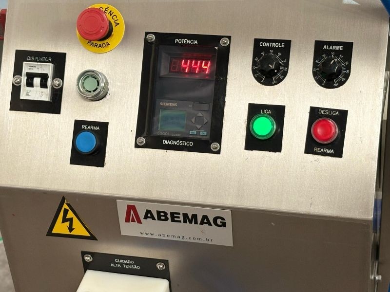 Seladora por indução ABEMAG – 2 KW, equipamento composto por: seladora, cabo de alimentação e cabeçote de selagem com suporte para acoplamento na esteira de frascos. (Esteira não inclusa)